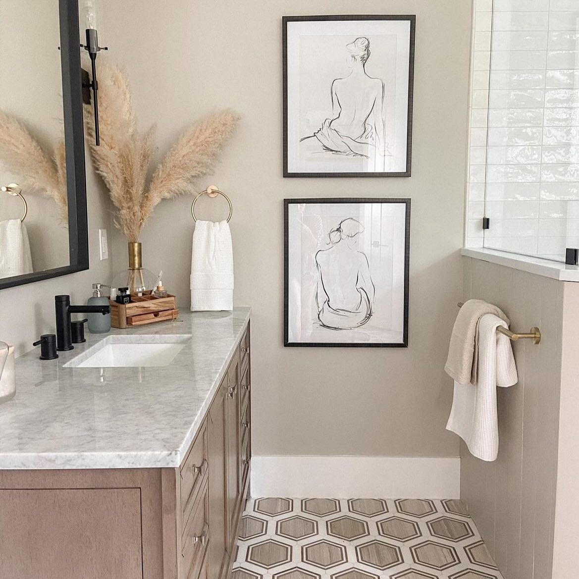 Because this color is so versatile you have many options when it comes to cabinet color if you decide to paint your walls Revere Pewter. A great option would be Chelsea Gray because they have a similar undertone. Alternatively, you can go lighter with White Dove.