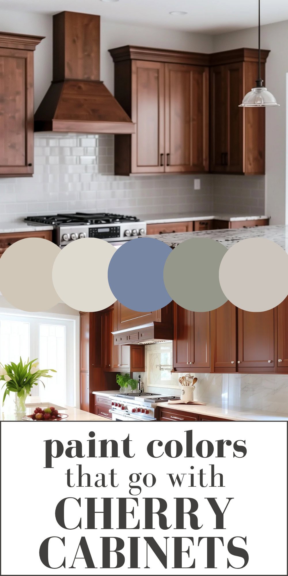 Neutral paint colors with taupe, warm gray, or pink-beige undertones help soften and tone down red hues in cherry wood. Colors like BM Pale Oak, SW Accessible Beige, and BM Balboa Mist are excellent options.