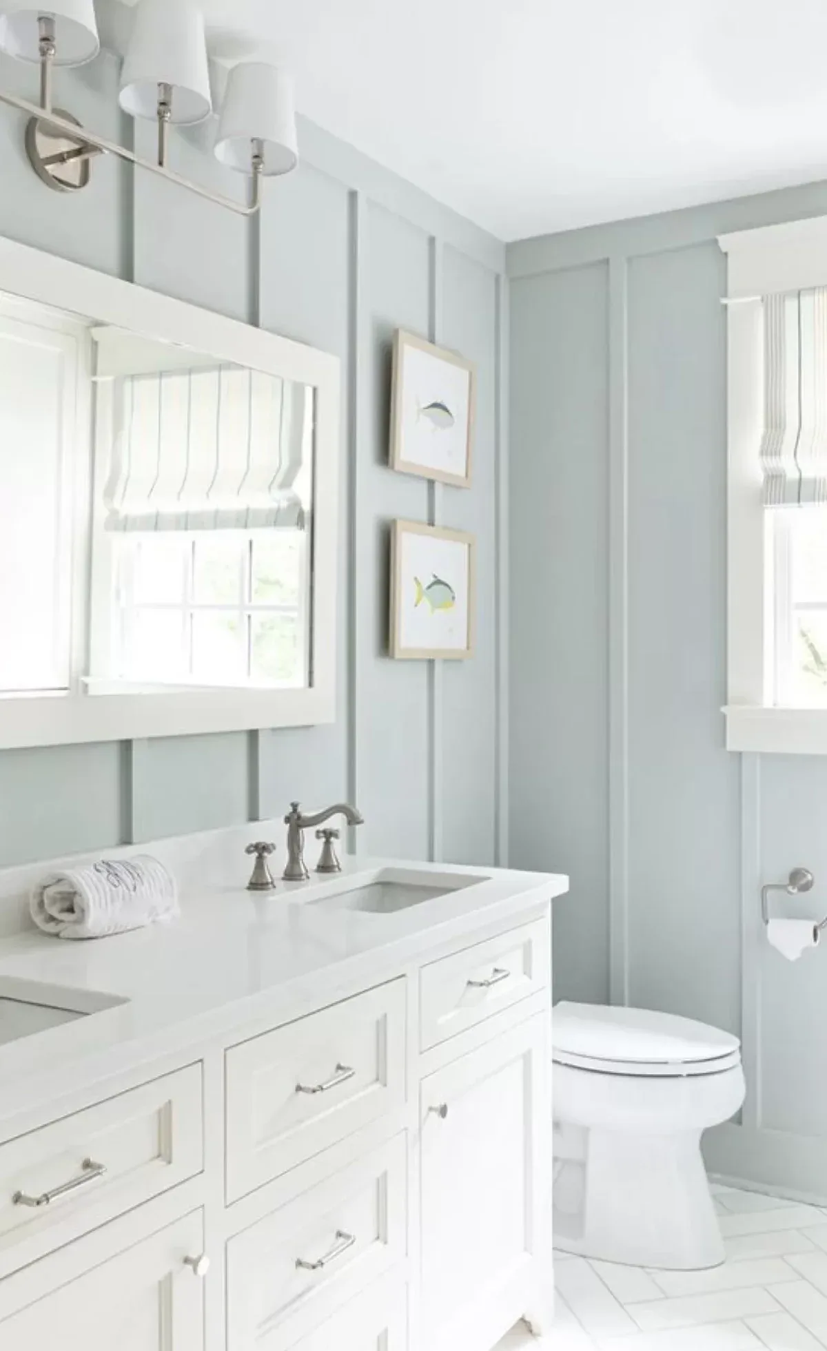 These blue-gray paint colors work particularly for bathrooms in terms of resale. By all means, pick one color for the entire house and stick to it. But if you’re just looking to refresh the bathroom, these colors are really pretty, calming and relaxing.