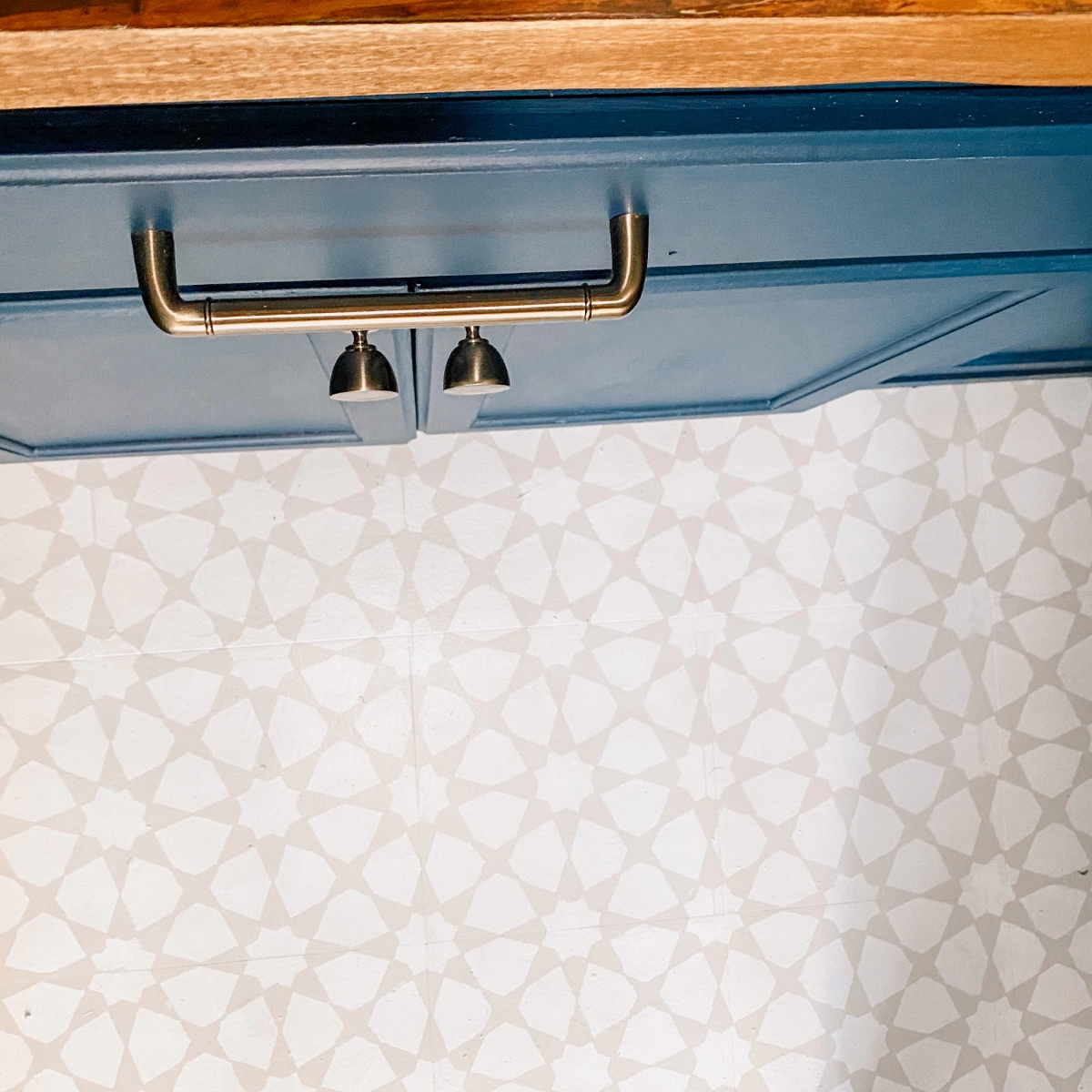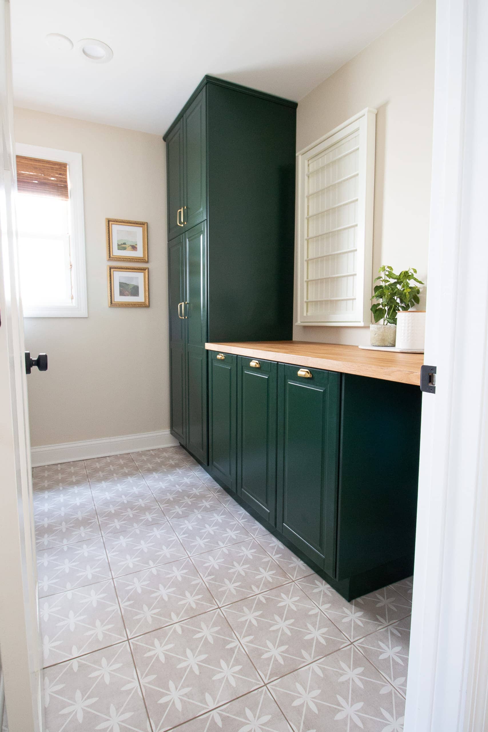 While we were lucky enough to be able to sand and stain our hardwoods before we move into our house, the kitchen floor, bathrooms and laundry rooms had ugly linoleum and tile flooring that desperately needed to be updated. Two of the spaces had luxury vinyl tile installed, the kids bathroom got a complete remodel including new tile and the laundry room got a fresh look with vinyl floor stickers (they’re not a long term solution but look awesome!)