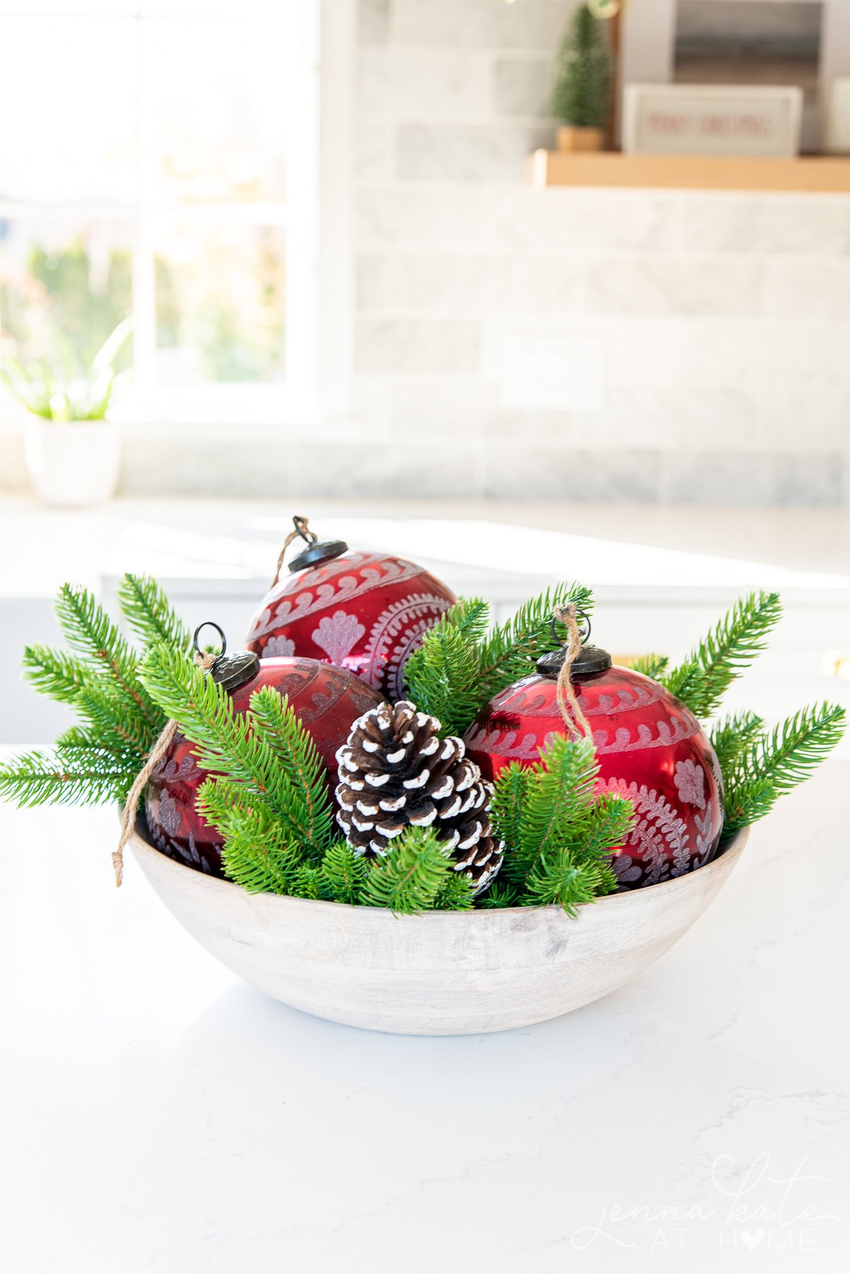 Simple touches on the counters such as tiny twinkling lights, ceramic houses and miniature Christmas trees are a simple nod to the season. A DIY advent calendar would be the perfect addition to this space!