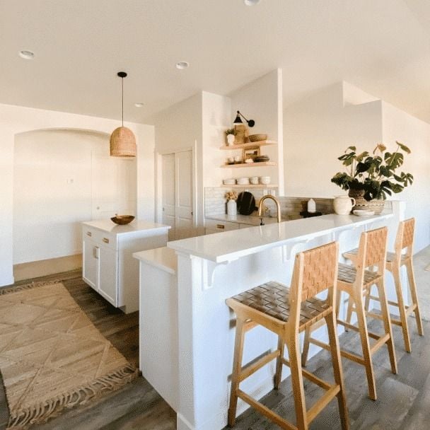 Origami White looks great in homes that have a modern farmhouse, boho, transitional, and contemporary theme. South and west facings rooms will notice more creamy and warmth coming from the walls, while north-facing spaces will look more neutral brining out the undertones.